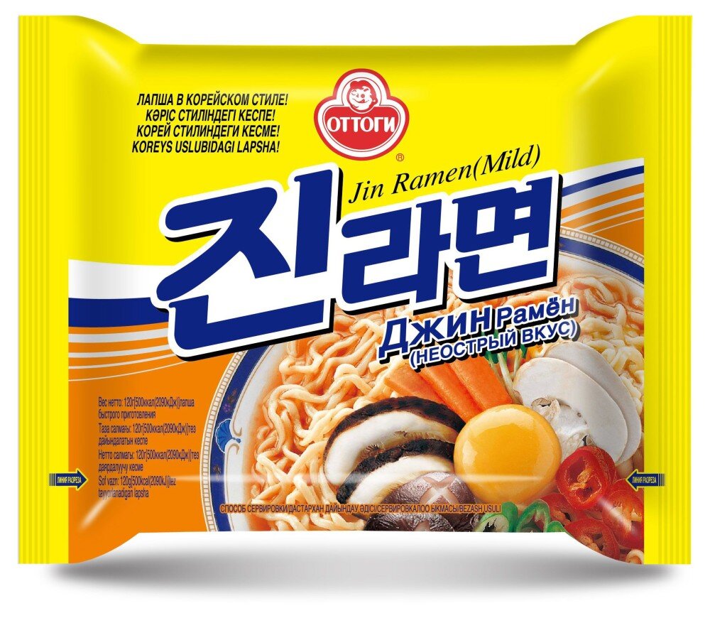 Лапша Джин рамен корейского бренда Оттоги – палочка-выручалочка для всей семьи, когда на приготовление полноценного обеда нет времени. Это питательный и ароматный суп с классической пастой рамен. Густой говяжий костный бульон обеспечивает ему глубокий и мягкий вкус умами, а хлопья сушеных овощей, грибов и ламинарии придают свежесть и текстуру.