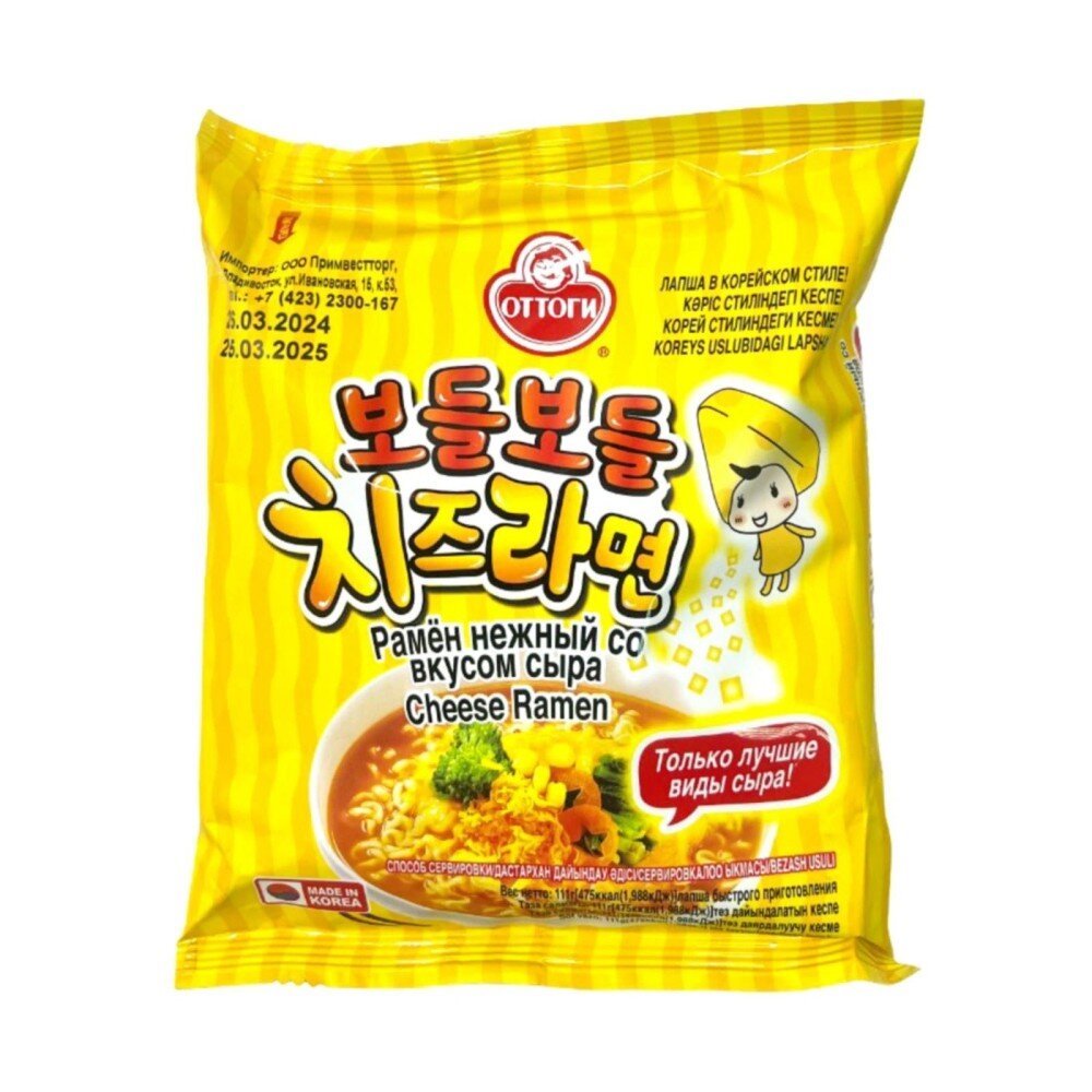 Лапша Ottogi Нежный сыр Рамен обладает богатым и кремовым сырным вкусом, который понравится как взрослым, так и детям. Нежный и насыщенный сырный бульон делает каждую порцию особенной. 111 г Корея